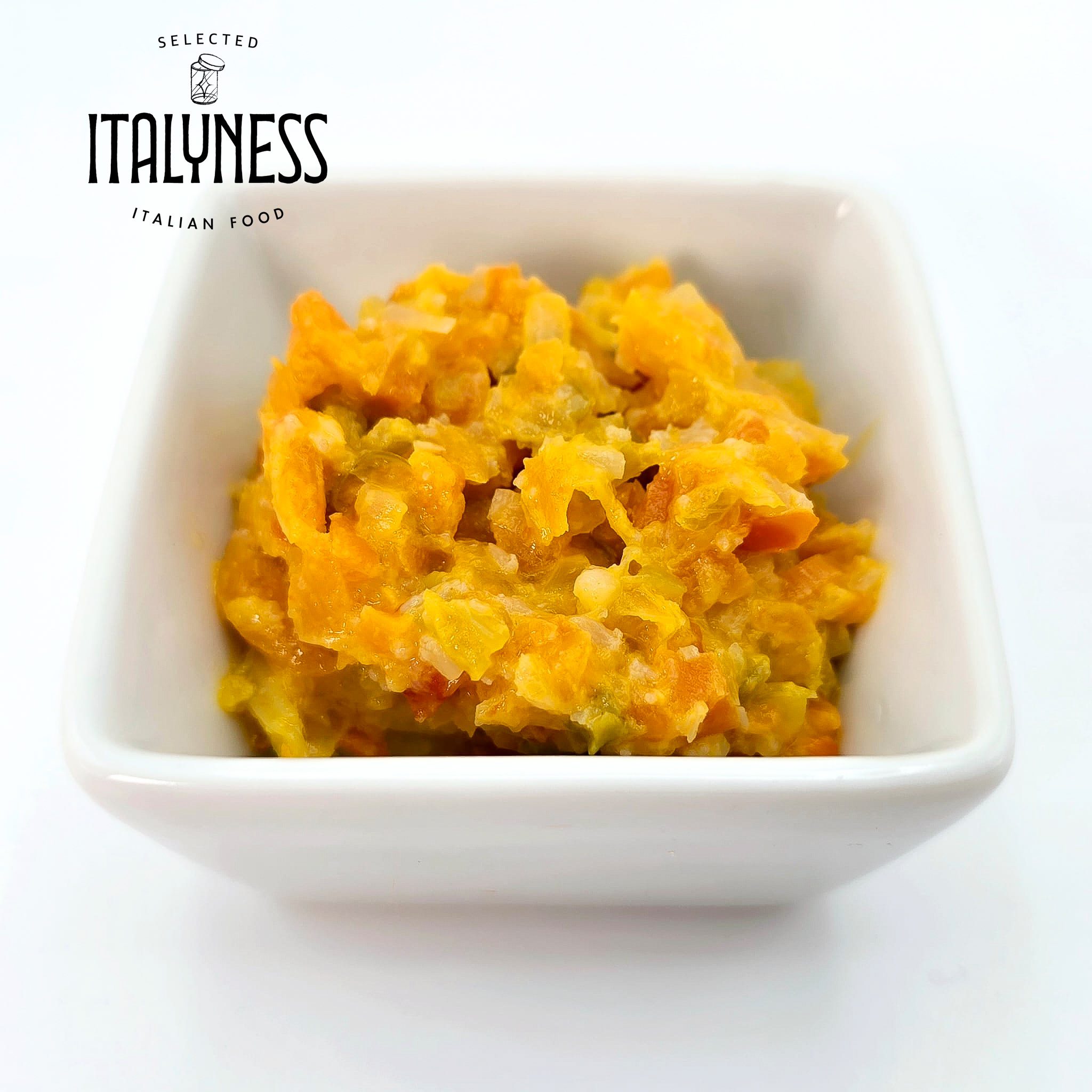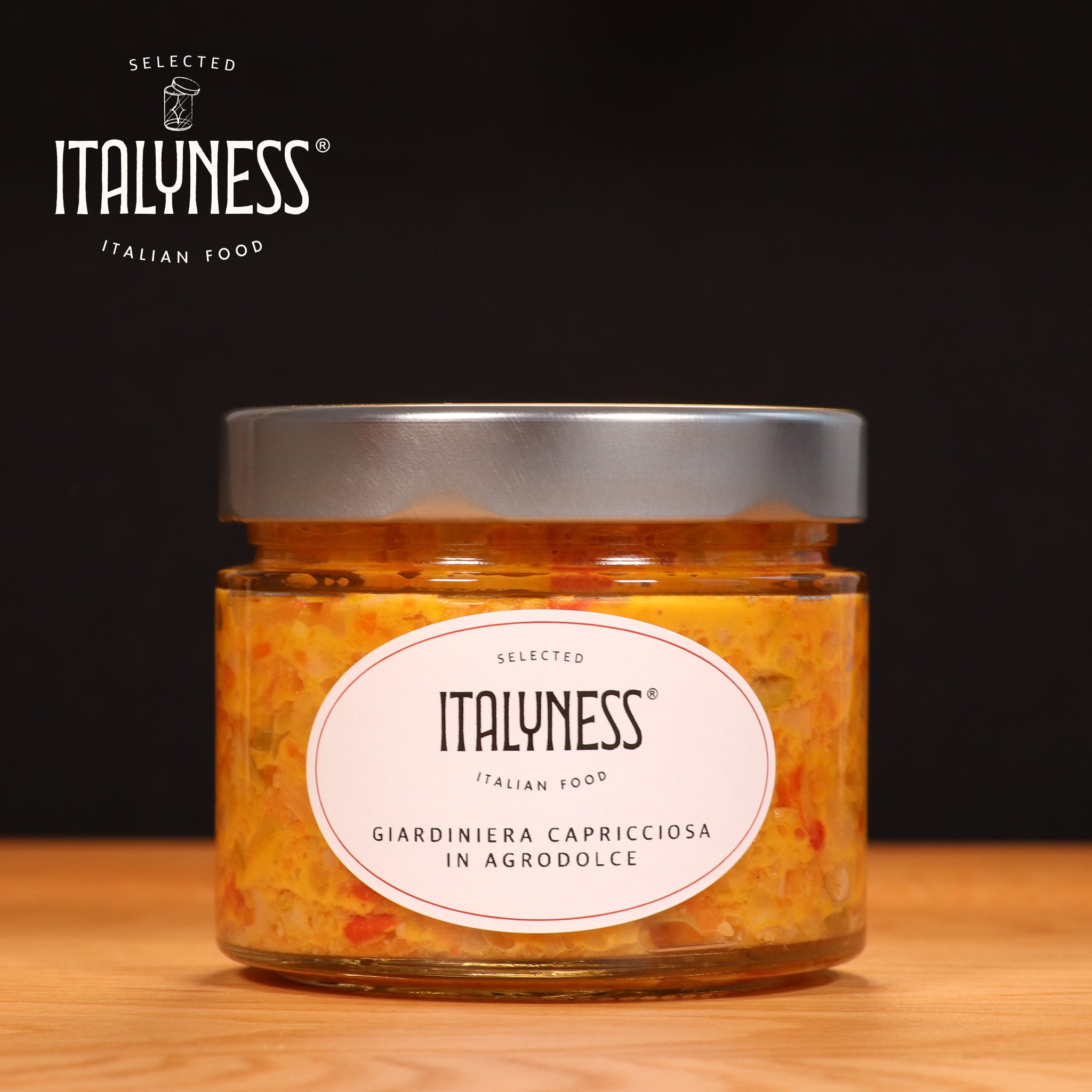 La Giardiniera Capricciosa in Agrodolce è una squisita specialità preparata con ingredienti genuini, senza alcun additivo, e con verdure provenienti da agricoltura sostenibile, nel rispetto dell’ambiente, con il gusto autentico della tradizione contadina. La ricetta prevede l’utilizzo di Peperoni, cipolle, SEDANO, cavoli, carote, fagiolini. Il sapore caratteristico e la croccantezza degli ingredienti rendono la Giardiniera Capricciosa in Agrodolce perfetta con antipasti di salumi, uova e in accompagnamento ai bolliti. È ottima per farcire toast e sandwich.