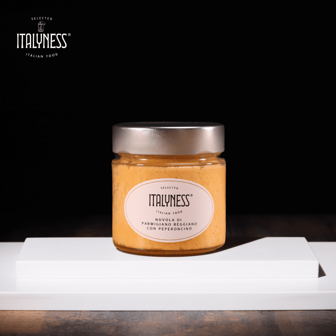 La Nuvola di Parmigiano Reggiano con peperoncino è una crema gourmet dal carattere deciso che unisce la profondità aromatica del celebre formaggio stagionato italiano a una piacevole nota piccante. La base di Parmigiano Reggiano DOP dona alla crema una consistenza vellutata e avvolgente, mentre il peperoncino aggiunge una delicata vivacità che esalta le note intense e sapide del formaggio senza coprirne l’eleganza. Il risultato è una crema equilibrata, ricca e leggermente piccante, capace di esprimere tutta la personalità del Parmigiano con un tocco di energia.