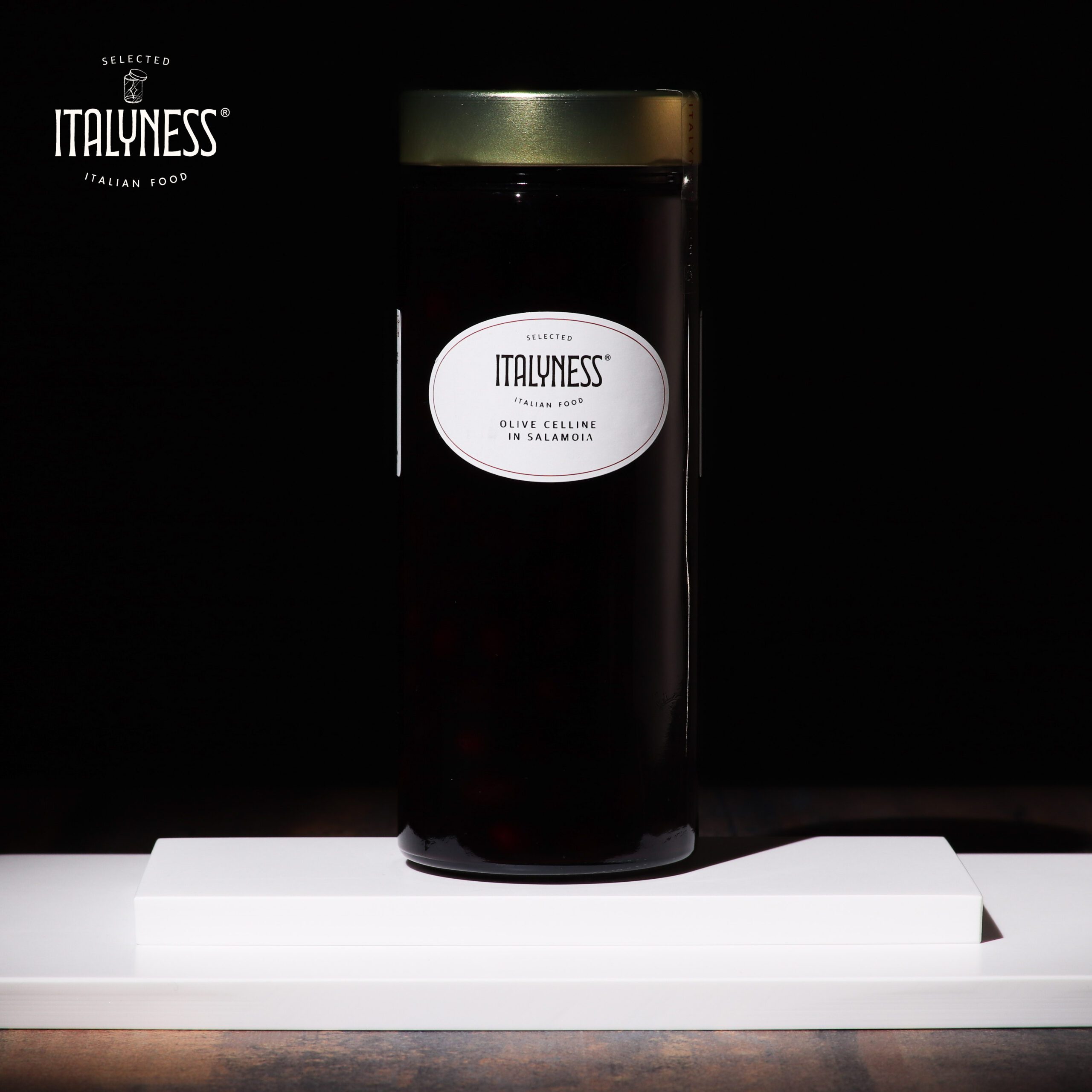 Olives Celline en solution aqueuse avec une salinité supérieure à 5% et prêtes à la consommation. Couleur noire profonde, saveur intense avec un arrière-goût légèrement amer et une sensation de piquant.