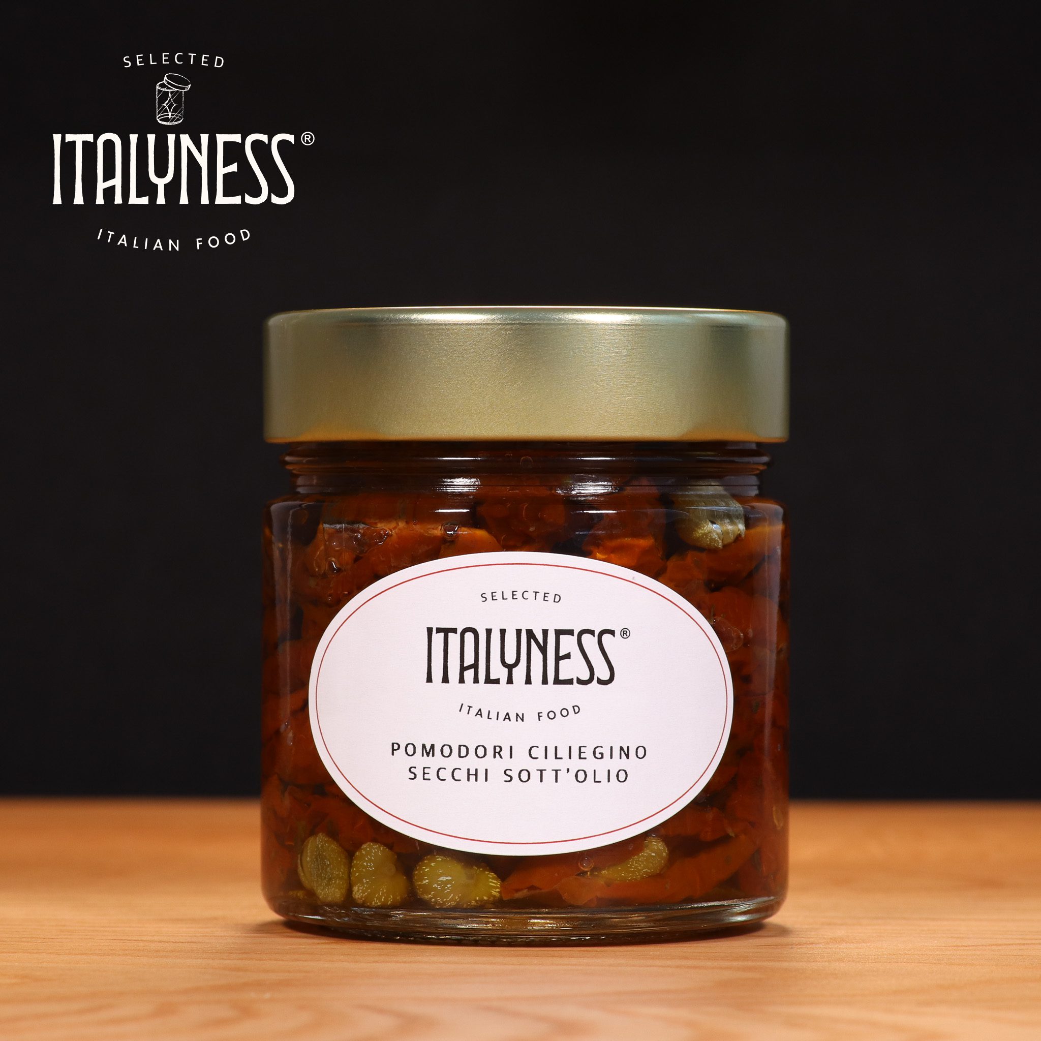 Il Pomodoro della varietà Ciliegino è di dimensioni più piccole rispetto al normale pomodoro, con un caratteristico sapore leggermente dolce e dal sapore aromatico intenso e persistente; è comunemente utilizzato nelle insalate, per guarnire piatti o anche naturale. I Pomodori Ciliegino vengono essiccati al caldo sole estivo; successivamente alla completa essiccazione vengono lavorati a mano secondo un antico processo tradizionale tramandato da generazioni: i Pomodori Ciliegino vengono leggermente reidratati e poi posti sott’olio con menta, origano, prezzemolo, sale, capperi e un pizzico di zucchero per mitigare la naturale acidità.